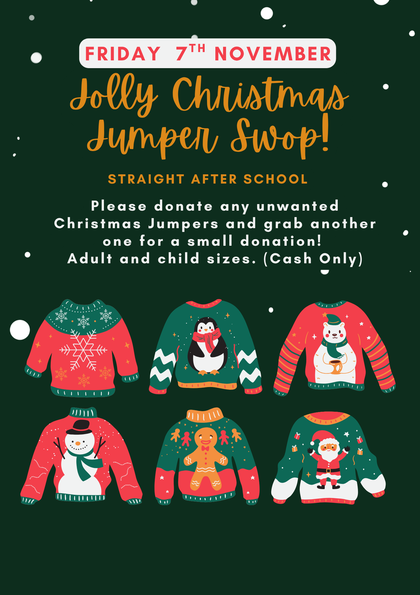 Good afternoon, Please find attached a flyer regarding our Christmas Jumper Swop. If you have any jumpers that you would like to donate, please can you drop them into the office in readiness for Friday. (Child or Adult sizes). We hope to make this event a success with your help and start the festivities early! (Sorry about that!). Thank you.